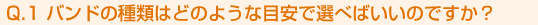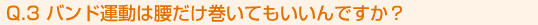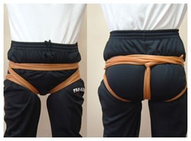 種類は大きく分けてチューブとワンタッチがあります。 @チューブ 締め具合を自由に調整でき、バンド運動で筋肉をゆるめて体の改 善を目的に使用します。 3m大・・・バンド運動の基本の巻き方に使用します。 4m大・・・バンド運動の基本の巻き方、応用の巻き方などあらゆる 巻き方に対応できる万能型です。 5m中・・・椎間板ヘルニアに効果がある三角巻き、二重三角巻きの 時に使用します。 この巻き方は骨盤巻きに次ぐ基本的なバンド療法で多く の症状に応用できます。 2m中・・・バンド運動時に膝に巻いたり、痛い時に腕、足などに使 用します。 Aワンタッチ 腰が痛い時、腰痛予防のために長時間巻く事で体のサポートを目 的に使用します。サイズは各S(85cm)、M(95cm)、L(105cm)が あり、ヒップサイズを目安にして下さい。 シングル 腰専用バンド ダブル サポート力をパワーアップした二枚重ねの穴あきタイプ。 ムレにくく、幅違いのゴムでずれ難くなりました。