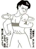 | バンドをたすき巻きにして両腕を前後にグルグル回します。肩こりの解消によい運動法です。